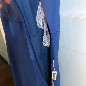 Retro Jolie size 16 blue dress from Sears, new but old with tags. Perfect dress for summer tea parties, summer cruises, weddings, proms or church. Sleeveless, zipper , cuts down in front and back with a crisscross.