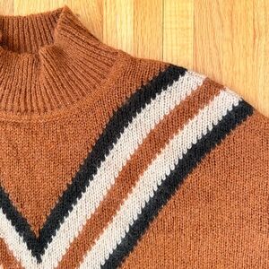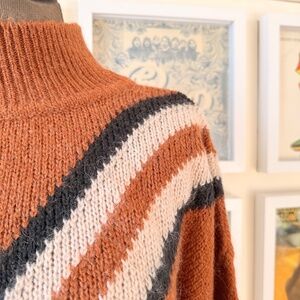 rust, chevron pattern, knit sweater, cozy, oversized, fall fashion, winter wear, mock neck, ribbed cuffs, slouchy
