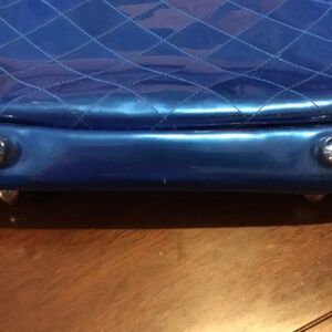 Beautiful shiny blue handbag that measures 10" down - 16 across -3" wide at the bottom. 4 metal bullet feet. 3" wide on the sides of the handbag. Two 26" wide straps for over your shoulder. The straps continue 3 " down onto purse and secured with 3 metal pins. Heavy kiss lock that snaps shut. The inside has leopard lining fabric with a inside zipper pocket