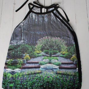 A retro graphic tank top with nature design and stripe overlay. Edged in black with pretty tie back. Lightweight flowy material. Tunic length.