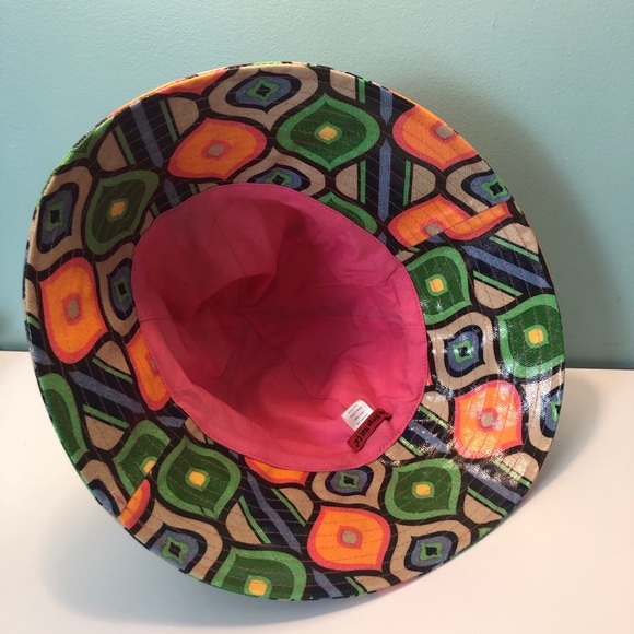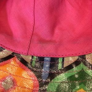 PVC coated cotton with bright pink cotton lining. Marked as O/S with slit clean care instructions. Never been worn. Please see last photos for some fabric imperfections: