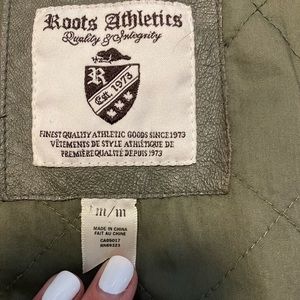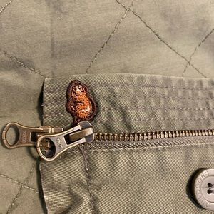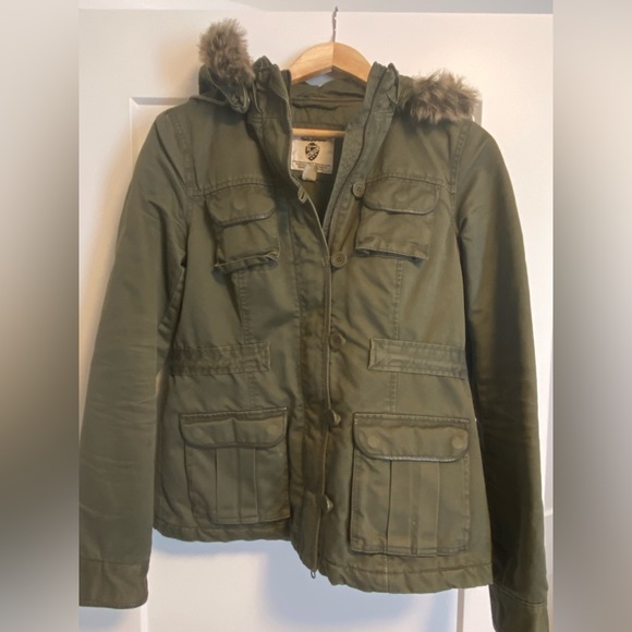 In great condition! Military style jacket with detachable hood. I would say this is more of a lighter mid weight jacket. Leather trim on all outside seams. Pet friendly home.