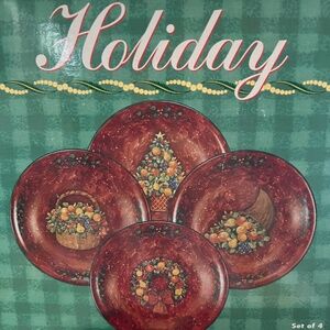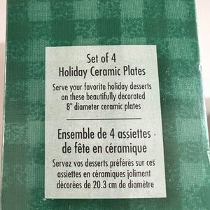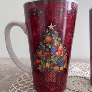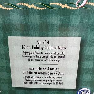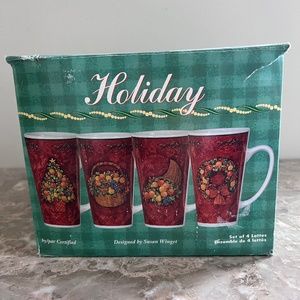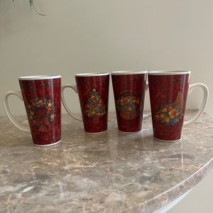 Matching CIC mugs & plates designed by Susan Winget! Set of 4 lovely ceramic tall mugs that stand 6" tall and holds 16 ounces. Set of 4 dessert plates, 8" in diameter. In original boxes. A great way to serve up festive hot chocolate and cookies! In excellent condition with no chips/cracks/crazing.