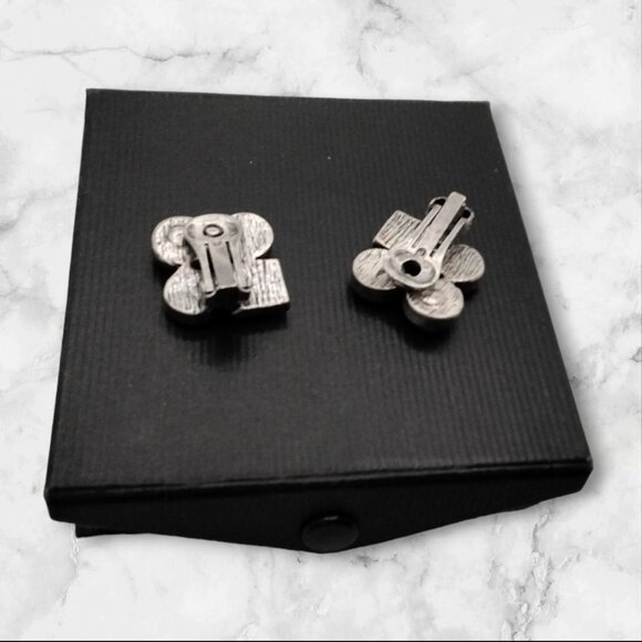 These are fun silver and black earrings from times gone bye. They are clip-on style and are .75 inches square, made of silver tone metal with acrylic black and shiny "rhinestone" embellishments. I would estimate their age to be from the 1960s/70s. Perfect for your retro/vintage costume jewelry collection that would still look great now!