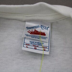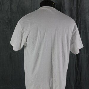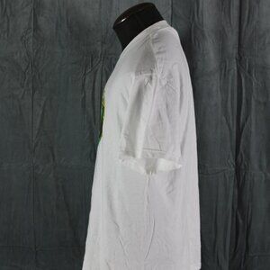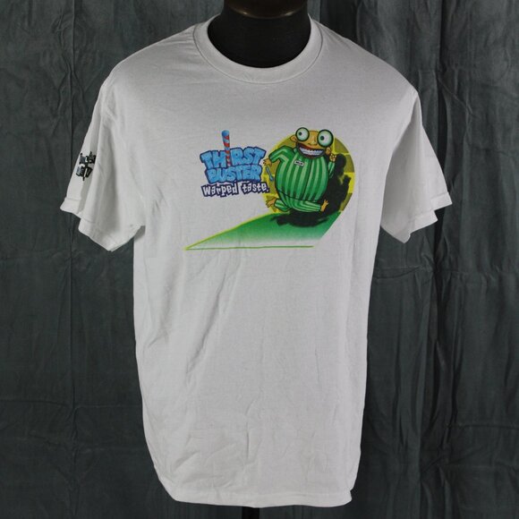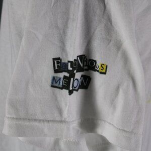 Up for sale is a retro slushy shirt. It has a white base colour a graphic of a fugitive melon and thirst buster screened on. The right sleeve has Felonious Melon screened on. What a great shirt do not miss out on it.