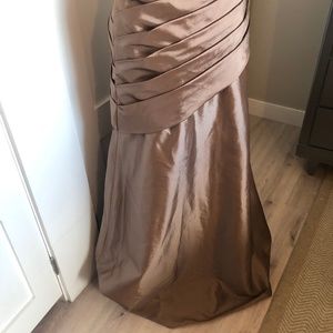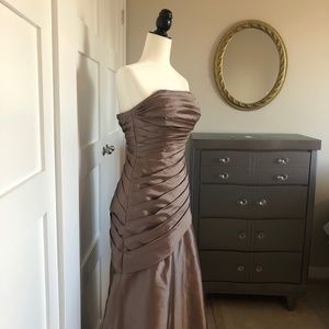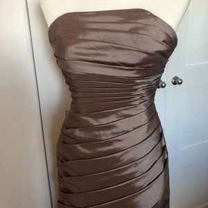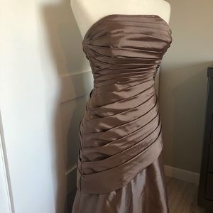 "Retro Strapless Taffeta Prom Evening Bridesmaid Dress | Pleated Bust to Hip, Full Skirt, Dark Tan/Brown Hue