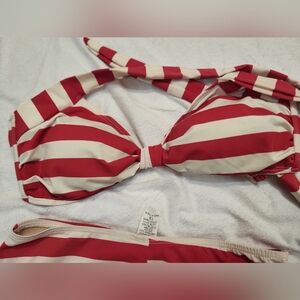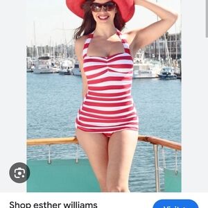 Esther Williams "retro" style high waisted bikini. Featuring neck ties and High Waisted bottom with half skirt in front. This is used, in good condition. Size 12 (runs smallish...fit me at a size Medium/waist around 29").