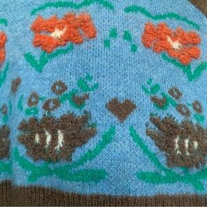 Very cute retro style and blue sweater vest with floral patterns. Features red and green accents.