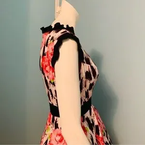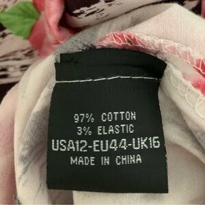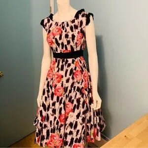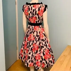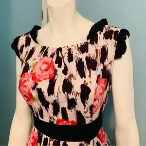 This fun ‘50s-style retro swing dress features pink roses and brown designs on an off-white background. Has a circle skirt for twirling and wide shoulder straps to keep bra straps hidden - great for dancing in! Add a crinoline for extra poof (shown here with a crinoline underneath; not included). Pair with a parasol and retro heels to complete the vintage look, or add ballet flats and a ponytail.