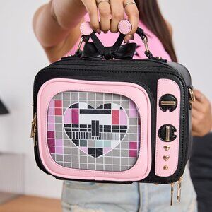 Retro TV Shaped Ita Backpack with Pin Display and Inserts Pink Crossbody Purse