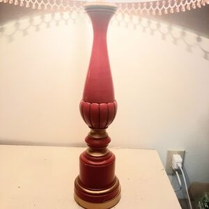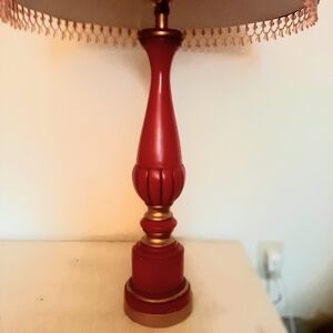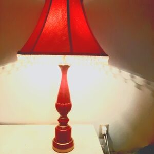 Illuminate your space with this elegant red table lamp. Its vibrant color adds a touch of sophistication to any room. Has a few age appropriate boo boos. Stands 32 inches tall. Shade diameter is 17 inches.