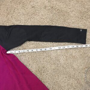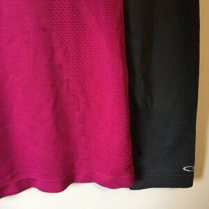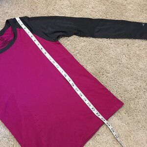 Very good preowned condition, long-sleeved, lightweight, hot fuchsia/pink work out top with long dark grey-almost black sleeves by Champion. Built for comfort and workouts all year round.