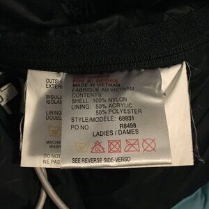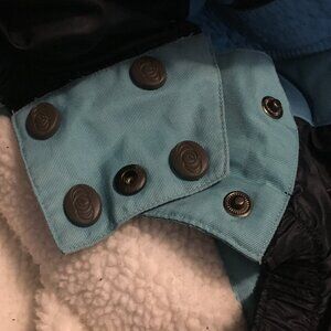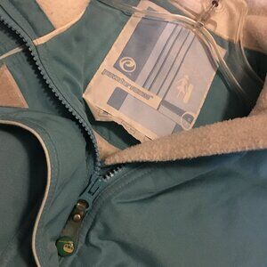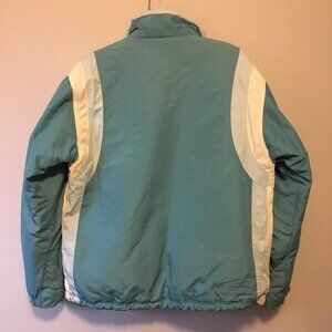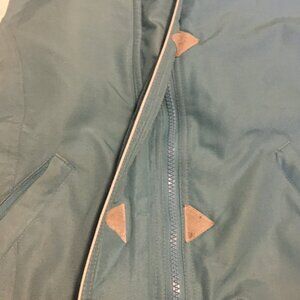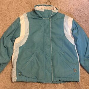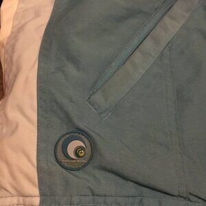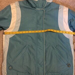 Very good preowned condition Powder Room retro blue and white snowboarding jacket. Beautifully made with great attention to details (built in pockets for ease of showcasing snow passes, extra buttons and closures for fit, zippers on arms, fleece lining, warm trims, quality waterproof materials). This jacket has it all. Because of the size of this piece, I will not be able to launder it before shipment, but the price is right.