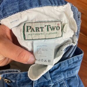 100% cotton. Fabric like a lighter weight, worn in denim feel