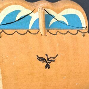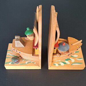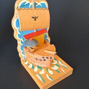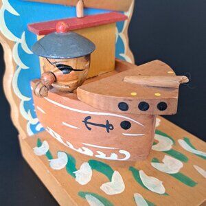 This is a pair of colourful wood vintage pirate ship-themed bookends made in Switzerland. They are missing a few pieces, and have some damaged parts due to age and use, but are overall in good condition. They are just under 7 inches tall and just under 4 inches wide. They are quirky and would be a lovely addition to a pirate, nautical, or ship-themed space, perhaps in a child's room or home office/library. A conversational piece for sure!