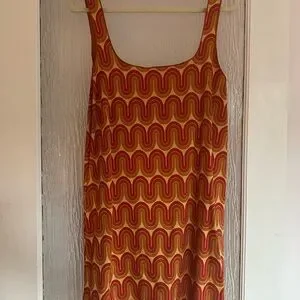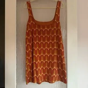 Embrace a vintage vibe with this retro wave pattern dress. Featuring vibrant orange and red hues, this dress is perfect for making a bold statement and in the spring summer months!
