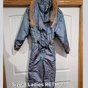 Stay warm and stylish with this retro women's snowsuit featuring a luxurious fur trim. Perfect for winter adventures.