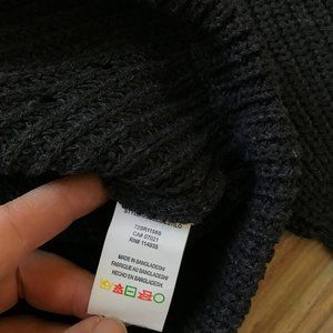 RetroD rib knit sweater in a dark gray heather color has a high mock neck and cropped length with drawstring around the bottom edge. Open-stitch detail along shoulder & side seams. 70% recycled cotton/30% polyester, tag says hand wash or dry clean. Tag size is women's "Large" - see below for garment measurements. Pre-owned conditition: some pilling to knit fabric. The pictures show the actual item that you will receive.