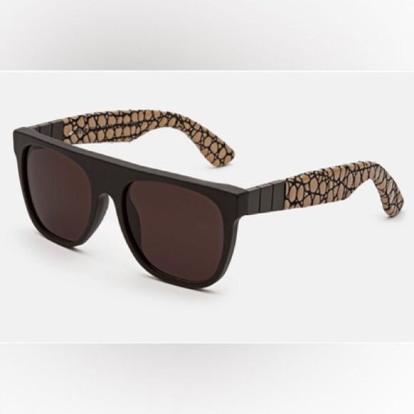 Chic black sunglasses with distinctive tan patterned arms. Ideal for a modern look.