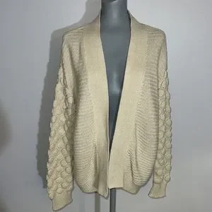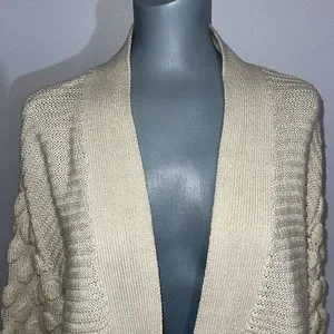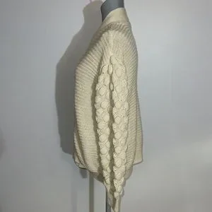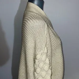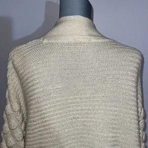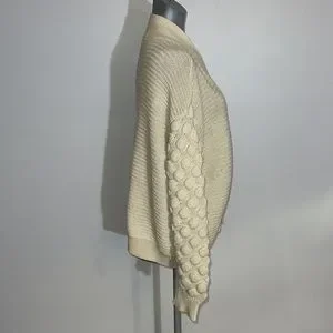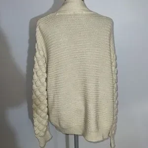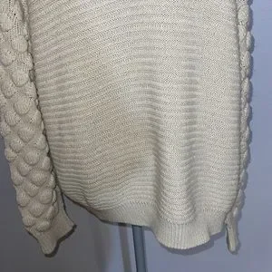 Super cute knit with different patterned puffy sleeves. Great for a cozy off the shoulder look and for layering.