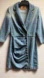 Chic blue denim dress with snap button-up front. Features a tailored fit and three-quarter sleeves. distress hem.
