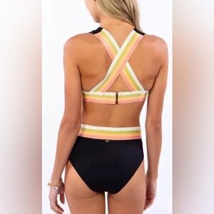 Retro-inspired black bikini set with pastel multi stripe detail - size Small (S)