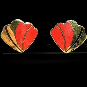 Retro-Vintage Lot of 2 Red & Gold Toned Earrings - 1 Signed AVON (Cherries). Such a cute lot; one gold toned metal and red enamel signed pair of cherry dangle stud earrings from Avon in the 90s, and one pair of red (possibly faux coral) and black enamel fan shaped earrings set in gold toned metal. fun and fancy! both pairs are in great condition, no major flaws to mention. cherries measure just about 1.75" in length (42mm) and fans measure just over 0.75" wide (20mm). gold toned backs are included. costume jewelry. estate sourced, history unknown.