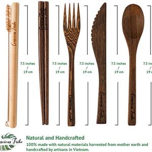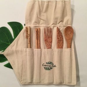 Brand new without box reusable 7 piece wood cutlery set for travel. Comes with spoon, knife, fork, chop sticks and straw with brush. Handcrafted by artisans, from coconut shells. Comes with lightweight and durable carrying pouch.