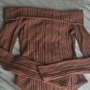 Elegant copper ribbed top with off-shoulder design. Ideal for a trendy outfit.