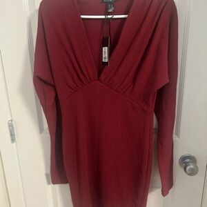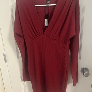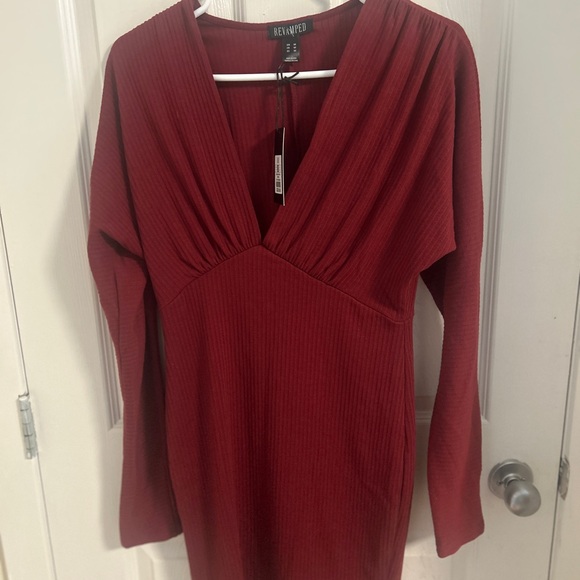Elegant deep red dress. Features ribbed texture. Long sleeves with a V-neckline. Perfect for any occasion.