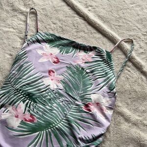 Embrace island vibes with this Revamped tropical print mini dress, Size Large, in great condition. Featuring a bold mix of green palm leaves and pink hibiscus florals on a soft lavender base, this dress is a vacation-ready gem that brings the heat wherever you go.