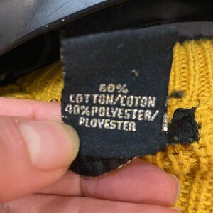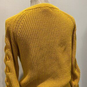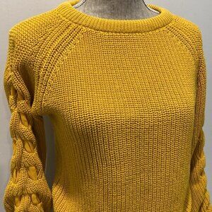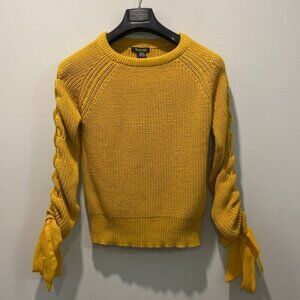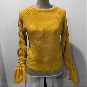 This fun Revamped Sweater Knits is mustard yellow, long-sleeved sweater with a crew neck and a ribbed knit texture. The sleeves have a unique design with a braided detail and a tie at the cuff. The sweater is made of 60% cotton and 40% polyester.. The sweater is in excellent, like new condition with no visible imperfections