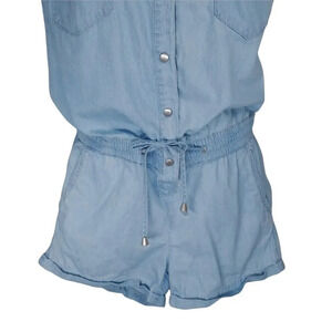 Lightweight faded blue denim romper/jumpsuit. Snap close to waist. Work shirt-like top. Double ch st pickets. Elastic waistband. Drawstring tie at waist as well. Cuffed leg. Functional front pockets. Silver coloured metal details.