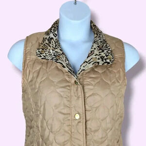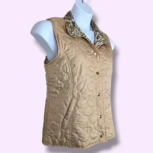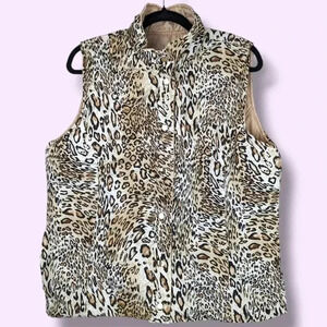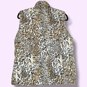 This 2-in-1 puffy vest can be worn as a beige vest with cheetah print accents, or a cheetah print vest with beige accents. Both sides are puffy and quilted either way. Both sides also have two front pockets and flat gold-tone snaps along the middle. Some of the buttons have some marks and tone loss due to wear but all function perfectly.