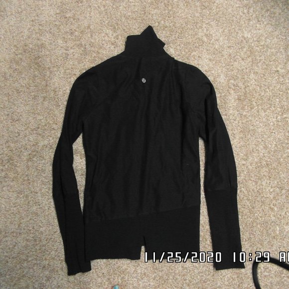 Black Lululemon sweater thats reversible. It has finger holes on the sleeves and is meant to be a fit tight. Barley worn, in great condition!