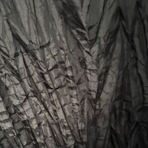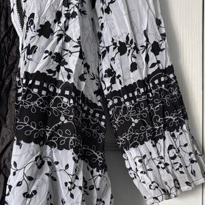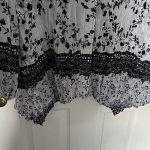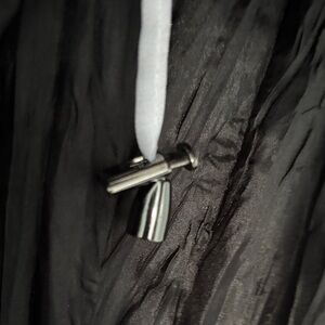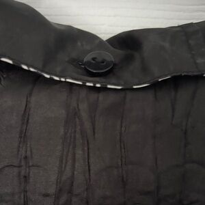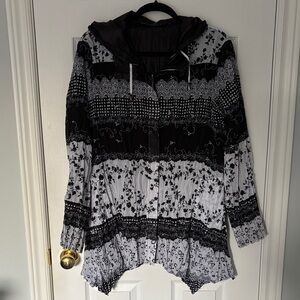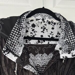 This versatile lightweight black and white jacket is reversible with an all-over floral and geometric print on one side and all black on the other. Features two side pockets, a front zipper, and a removable and adjustable hood. The crinkly satin-feel gives a relaxed fit for comfortable everyday wear. Does not have any tags on it due to it being reversible although it is machine washable with gentle spin and hang to dry. You can also hand wash it. XL