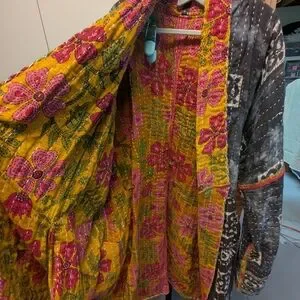 *This handmade jacket is made from upcycled cotton Sari fabric that is handsewn in layers into traditional Kantha blankets (in India). Irregularities in fabric are normal. Please Contact me before purchase if you'd like to know more about the fabric used.
