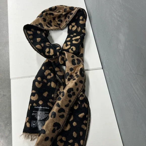 Stylish leopard print scarf with black and tan colors. Perfect for adding a chic touch to any outfit.