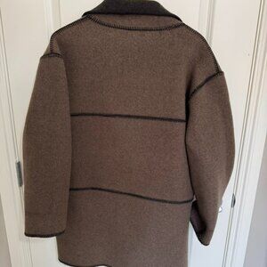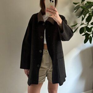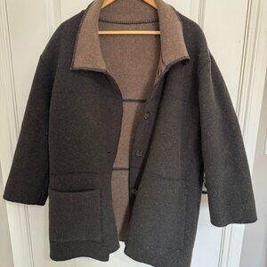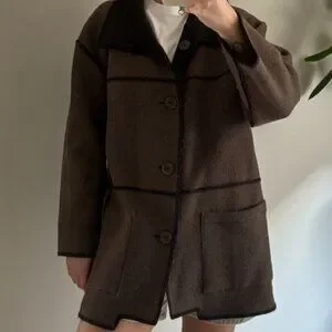 This made in Canada stunner is black/dark brown on one side and a medium brown on the other side and has a pocket on each. Incredibly warm for how light it is due to it's composition being primarly merino wool. Would fit a variety of people depending on if you like oversized or not!