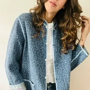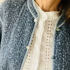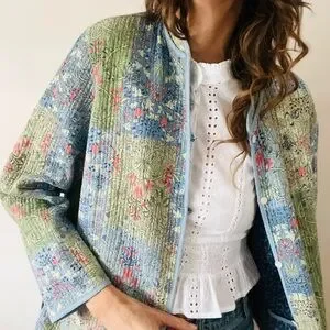 I love a generous jacket, and this prairie chore jacket has lots to give with its reversible pattern. Both sides provide ample sized front pockets, sweet tiny resin flower button fasteners, and lightweight cotton quilted comfort. Pretty blue on blue on one side and a patch work of soft pastel floral prints on the other, you choose, but any way you wear it, it’s looking good and feeling right.