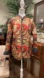 Beautiful reversible quilted jacket with pockets on both sides and decorative button front. One side features a rich gold, red, olive, and navy patterned textile, while the reverse is a deep indigo quilted denim with subtle stitched texture.