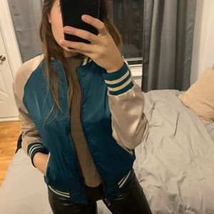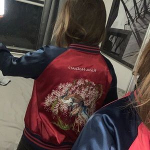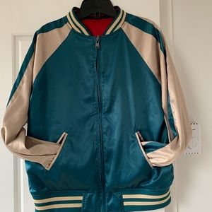 Very nice bomber jacket with reversible sides. On one side you have the green and beige look and on the other side you have the red and navy look.