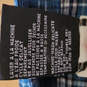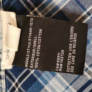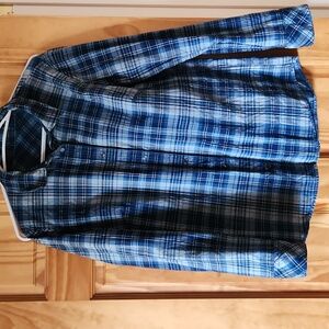 blue button up plaid long sleeve shirt. reversible - one side has thicker material (almost corduroy-like). the sleeves don't have buttons for those of you who like to roll them up that way.