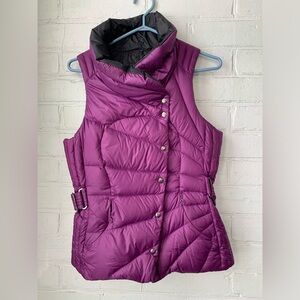 Stylish purple puffer vest with button details. Perfect for layering.