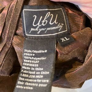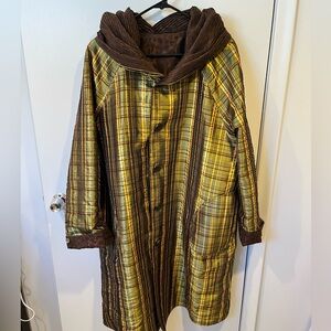 Dramatic reversible jacket with a pleated collar that can also be used as a hood. Pockets and buttons on both side.