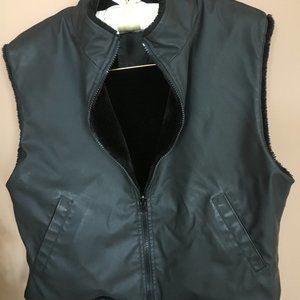 Reversible sleeveless vest is soft faux fur on one side and waterproof material on the other. Both sides have pockets. Zipper close. Ideal for cool days when a jacket is too much