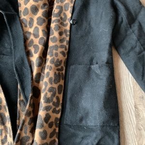 Black and Leopard reversible trench style jacket. Fits approximately as a size 12. Soft fuzzy material. Come with strap, one button. Unknown brand, bought at the Bay. Lightly used.