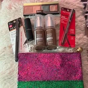 Revlon foundation duo with vibrant glitter pouch. Includes eyeliner and lipstick and more. Everything is BRAND NEW in its original packaging. See photos and zoom in to see all products.