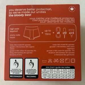 Made with ultra-soft and breathable bamboo ribbed fabric, they offer up to 12 hours of protection and can hold up to 70 ml. Perfect style for overnight wear for periods, or for postpartum and light bladder leaks. Breathable, stretchy, and comfortable.