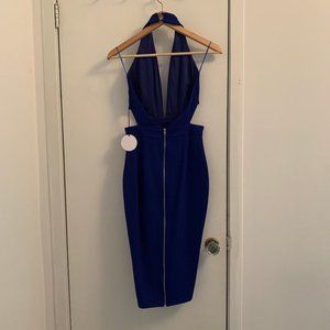 Royal blue in colour, halter neck, very low back, working zipper detail from bottom to lower back, cut outs on size, low cut